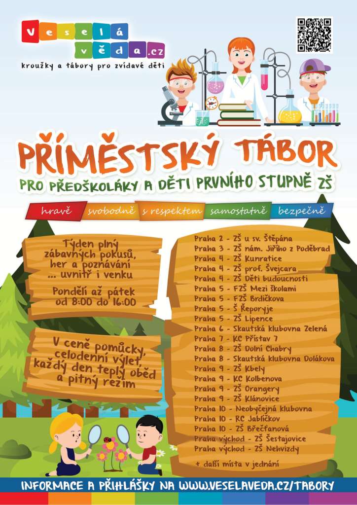Od roku 2011 pořádáme příměstské tábory pro nadšené děti, které si odnášejí nezapomenutelné vzpomínky a nové poznatky :) Příměstské tábory s programem od 8:00 do 16:00 jsou určené pro děti od 6 do 10 let. Program je rozdělen na 4 dny badatelských pokusů a her, 1 den celodenní výlet s přírodní tématikou. Zábavné vědecké pokusy a různorodé experimenty uvnitř i venku. V průběhu celého tábora budeme dělat i dlouhodobější pokusy, které s dětmi budeme pozorovat a vyhodnocovat celý týden. Každý den pohyb na čerstvém vzduchu, kde si zahrajeme pohybově zábavné hry. Každý rok jiná metodika.