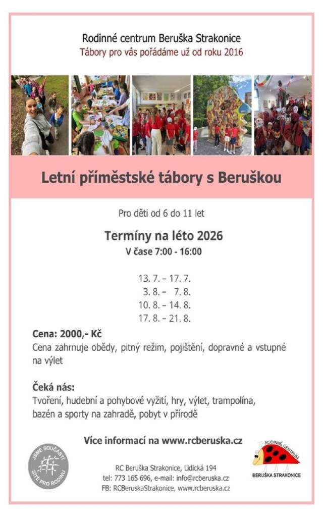 Příměstské tábory s Beruškou jsou pro děti 6 – 11 let. Zaměření tábora si zvolí děti sami podle toho, co je baví. Každou středu jezdíme na výlet. Program tábora je pestrý - tvoříme, soutěžíme, tancujeme, zkoušíme divadlo, pečeme, sportujeme...